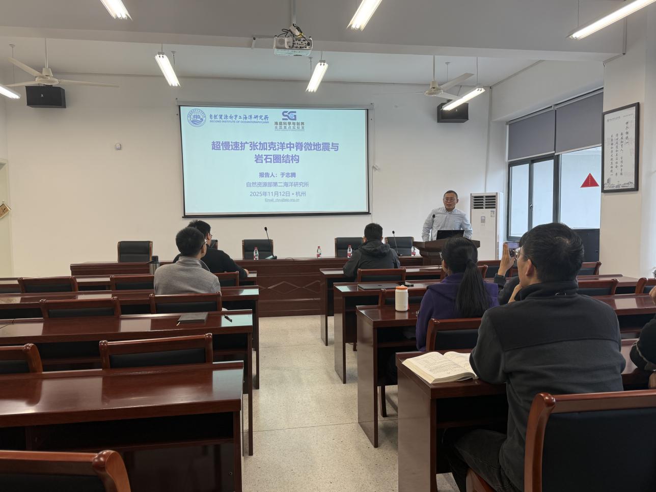 于志腾研究员作了题为《超慢速扩张加克洋中脊微地震与岩石圈结构》的报告。他从洋中脊作为海洋板块新生区域的地质意义出发,介绍了利用被动源地震探测技术研究洋中脊深部结构的最新进展,并分享了在慢速大西洋中脊和超慢速加克洋中脊区域的微地震观测成果。于志腾研究员是同济大学博士,国家自然科学基金优秀青年科学基金获得者,在《Science Advances》《Nature Communications》等期刊发表多篇论文,致力于海洋岩石圈结构与深部过程研究。