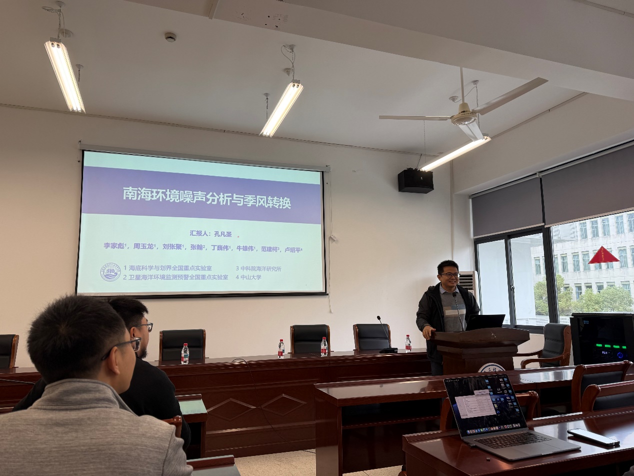 孔凡圣研究员以《南海环境噪声分析与季风转换》为题,系统介绍了地脉动作为环境噪声场中能量最强组成部分的科学背景,重点阐述了南海夏季风爆发对双频地脉动的影响机制。他结合南海海底与陆地地震仪数据,以及大气与海洋观测资料,论证了海底地震数据在季风早期探测与监测中的潜在应用价值。孔凡圣研究员毕业于美国密苏里科技大学,长期致力于海底深部动力过程与海洋环境噪声研究,成果发表于《National Science Review》《Geology》等高水平期刊。