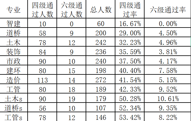 1.智建、道桥、土木专业四、六级通过率较低。