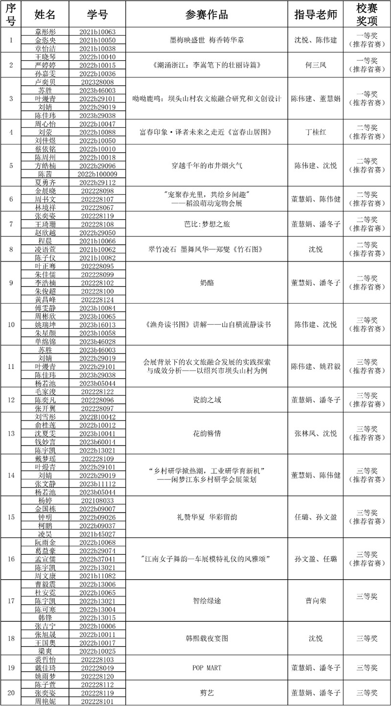 2024627日至20241027日我校成功举办了2024年校会展策划创意大赛,经过校外专家评审,评选出以下团队荣获校赛奖项,现将名单公示如下: