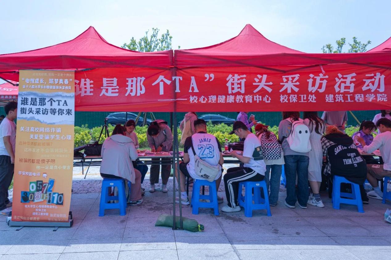 为响应南浔区“无诈南浔”的号召,进一步提升师生对网络诈骗的防范意识,关爱被骗学生的心理健康,我院联合校保卫处及校心理健康教育中心于5月15日在南浔校区西食堂门口举办了主题为“谁是那个TA”的街头采访活动。本次活动旨在通过实地采访和互动体验,让师生们深入了解网络诈骗的危害,同时营造关爱被骗学生的良好氛围。
