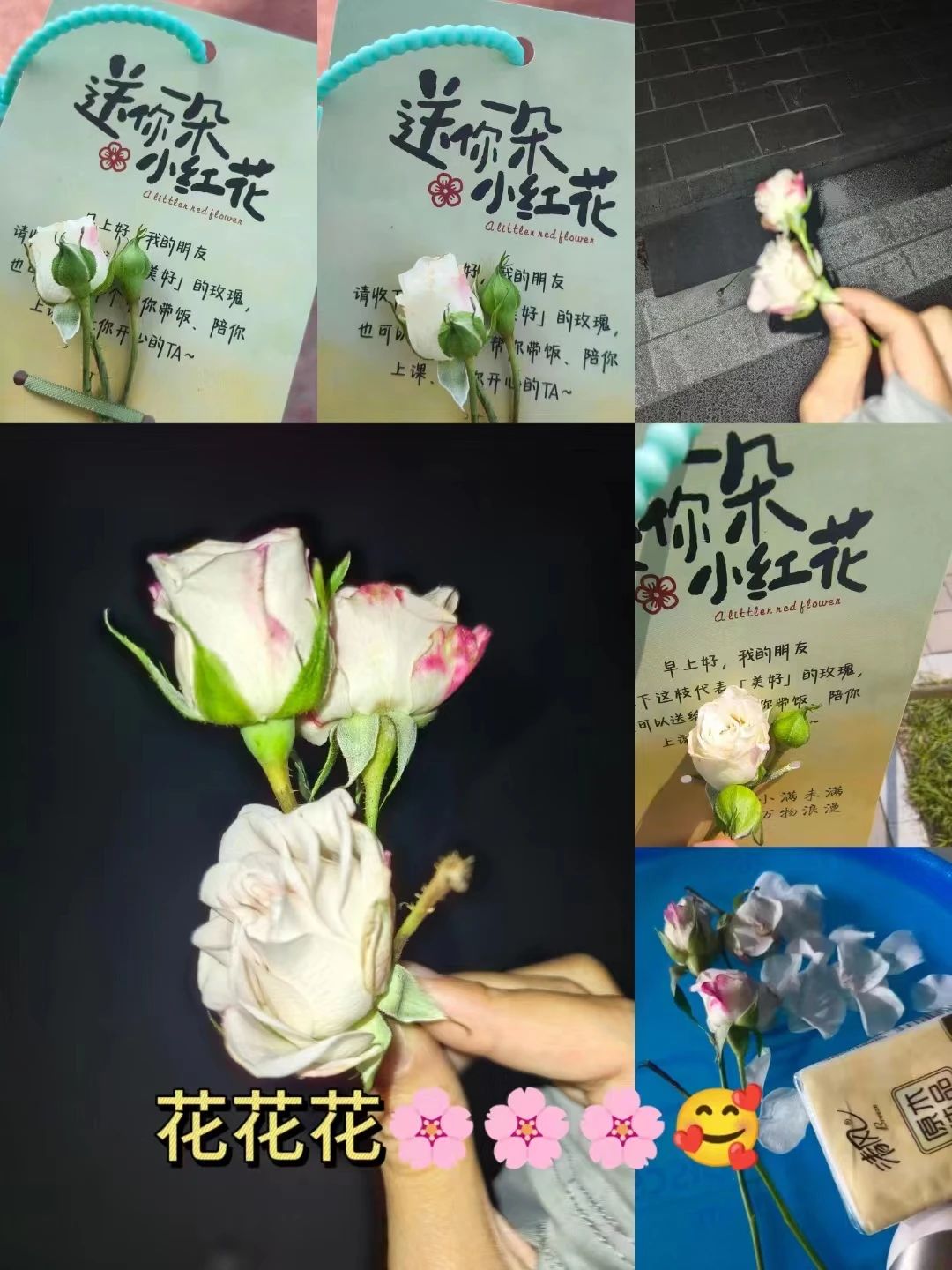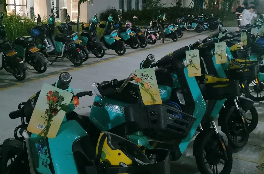 19日,志愿者们制作鲜花卡片,一枝枝色彩各异的玫瑰被绑在了写满祝福的定制卡片上,略带“偷感”地悬挂在共享电动车上,等待着清晨的曙光和同学们的目光。