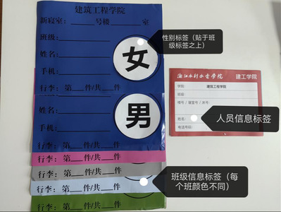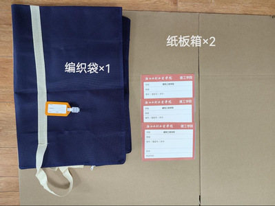 1.收纳物品:每人纸箱2个+行李袋1个。纸箱(尺寸:70✘50✘50)、编织袋(尺寸:80✘56.5✘25)。注意:全部物品请用学校统一发放的纸箱和行李袋封装存放,以便于搬迁统一管理。2.行李标签:每人每件行李贴三张,分别是性别标签(男、女)、班级信息标签(不同班级不同颜色)、人员信息标签(包含钱塘新寝室信息,圆形是女生,方形是男生)。