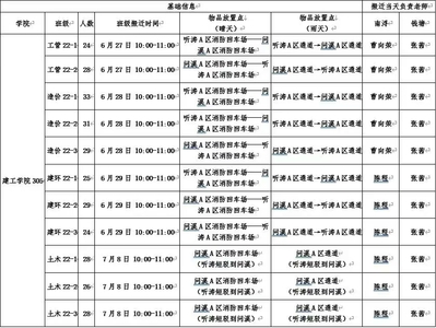 注意:请大家将各自行李物品提前打包,根据班级搬迁时间提前一小时将行李物品放置在各寝室楼下指定地点(见上表)。
